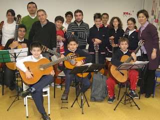 Por la tarde tienen clases extra-escolares. Aquí vemos una orquesta de guitarras.